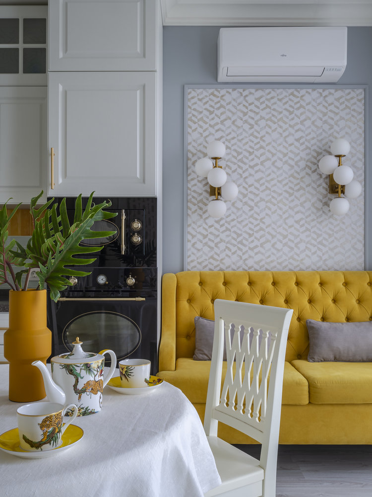 На стене за диваном повесили стильные и необычные бра, которые привлекают внимание и добавляют декоративности этой зоне.