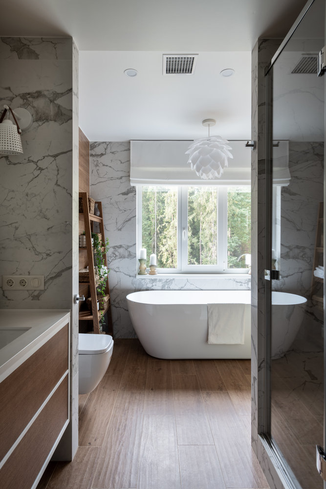 В общем санузле на втором этаже стоит отдельная ванна под окном, откуда открывается вид на лес. В этом же санузле есть еще душ.