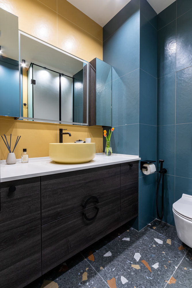 За основу была взята плитка фабрики Italon. Как акцент на полу и в зоне душа была использована плитка терраццо фабрики Arcana.
