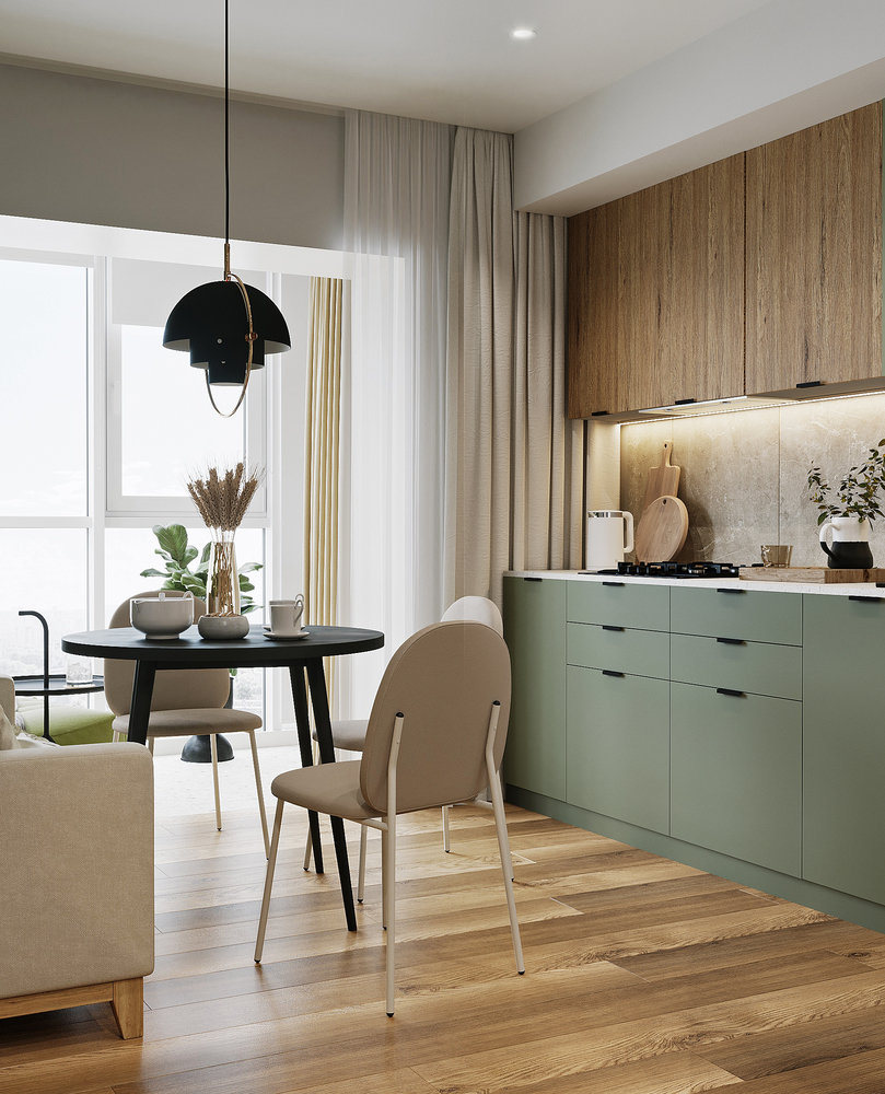 Так как кухня довольно компактная, дизайнеры выбрали для ее оформления преимущественно светлые оттенки — в первую очередь бежевый цвет, который дублируется также в прихожей и спальне, и сложный зеленый оттенок на стене за диваном и на кухонных фасадах.