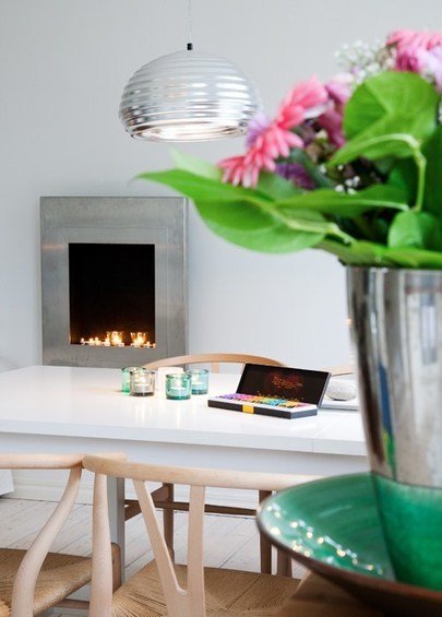 Фотография: Кухня и столовая в стиле Минимализм, Дом, Цвет в интерьере, Дома и квартиры, Белый, Камин, Лестница – фото на INMYROOM