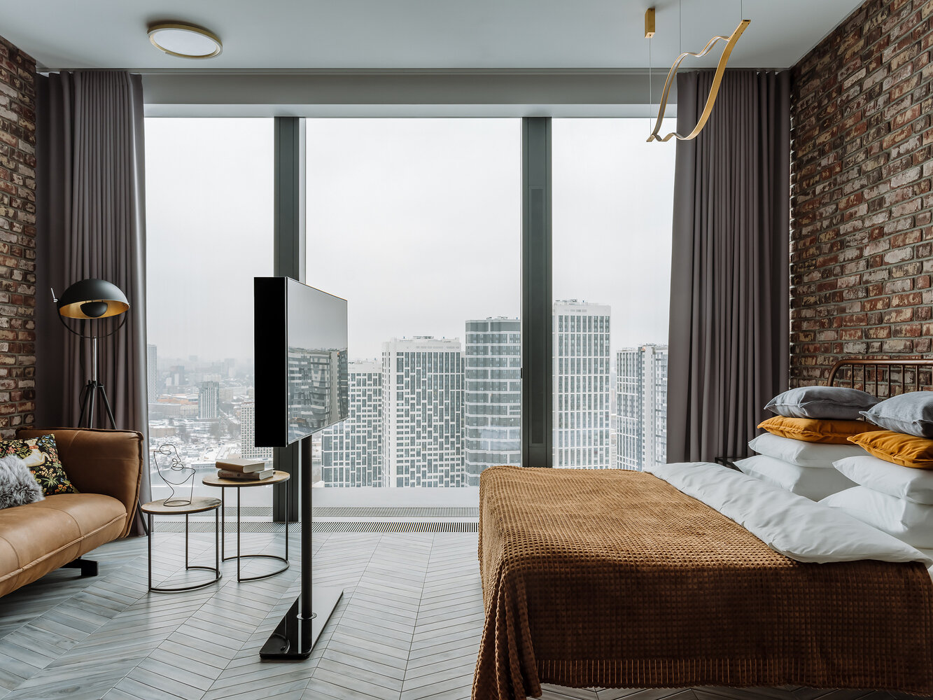 Главным достоинством помещения является панорамное окно во всю стену, что, безусловно, дает много дневного света. Так как квартира имеет форму прямоугольника, требовалось разместить мебель таким образом, чтобы оставить максимально открытое пространство, не перекрывать его перегородками, даже облегченными.