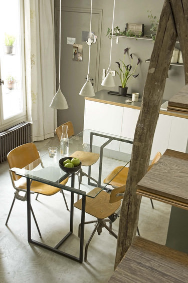 Фотография: Кухня и столовая в стиле Лофт, Скандинавский, Современный, Квартира, Цвет в интерьере, Дома и квартиры, Париж, Лестница, Зеленый, Бежевый, Чердак, Оранжевый – фото на INMYROOM