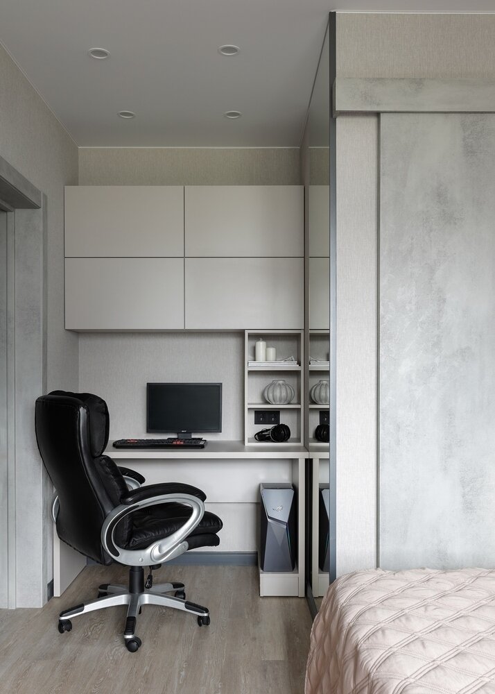 Помимо гардеробной в спальне хватило места для полноценного рабочего стола с системами хранения.