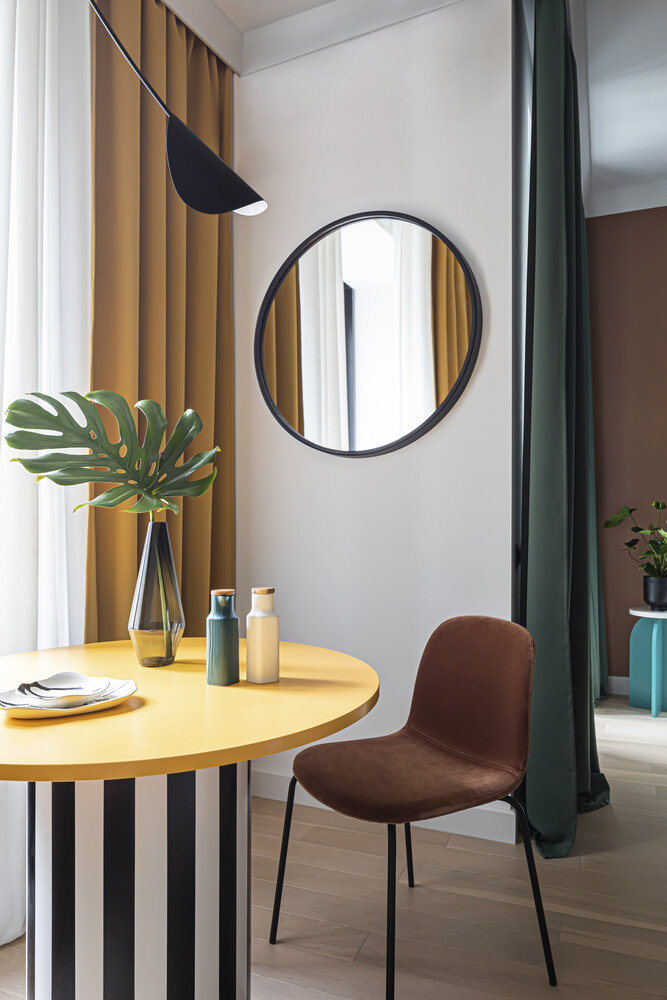 Одной из акцентных зон квартиры является столовая, где размещен эффектный обеденный стол с опорой в черно-белую полоску. Кстати, черно-белая полоска — также отличительная особенность этого стиля.