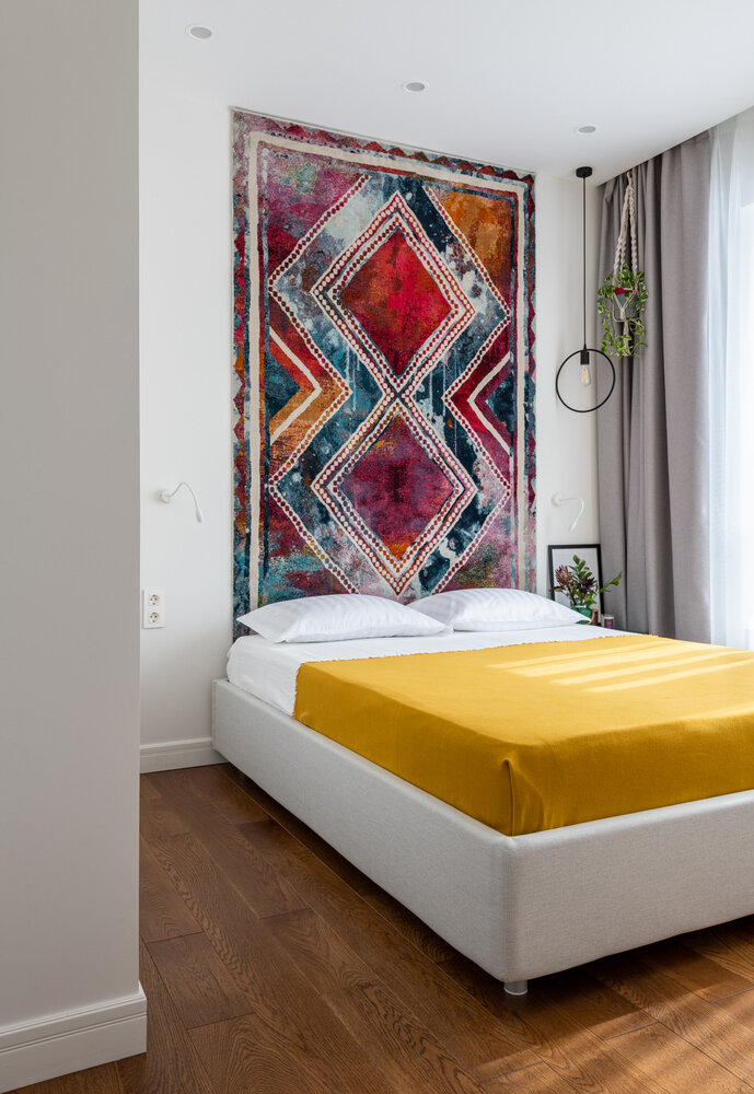 Уютная двушка 38 м² с белой кухней и ковром на стенеДизайн