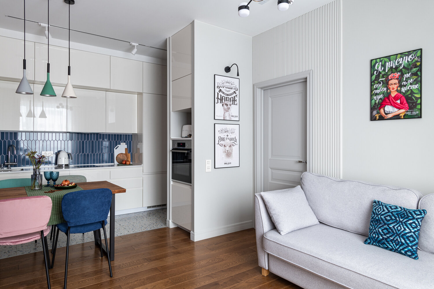 Уютная двушка 38 м² с белой кухней и ковром на стенеДизайн