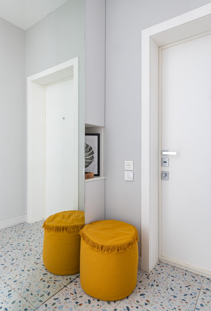 Уютная двушка 38 м² с белой кухней и ковром на стенеДизайн