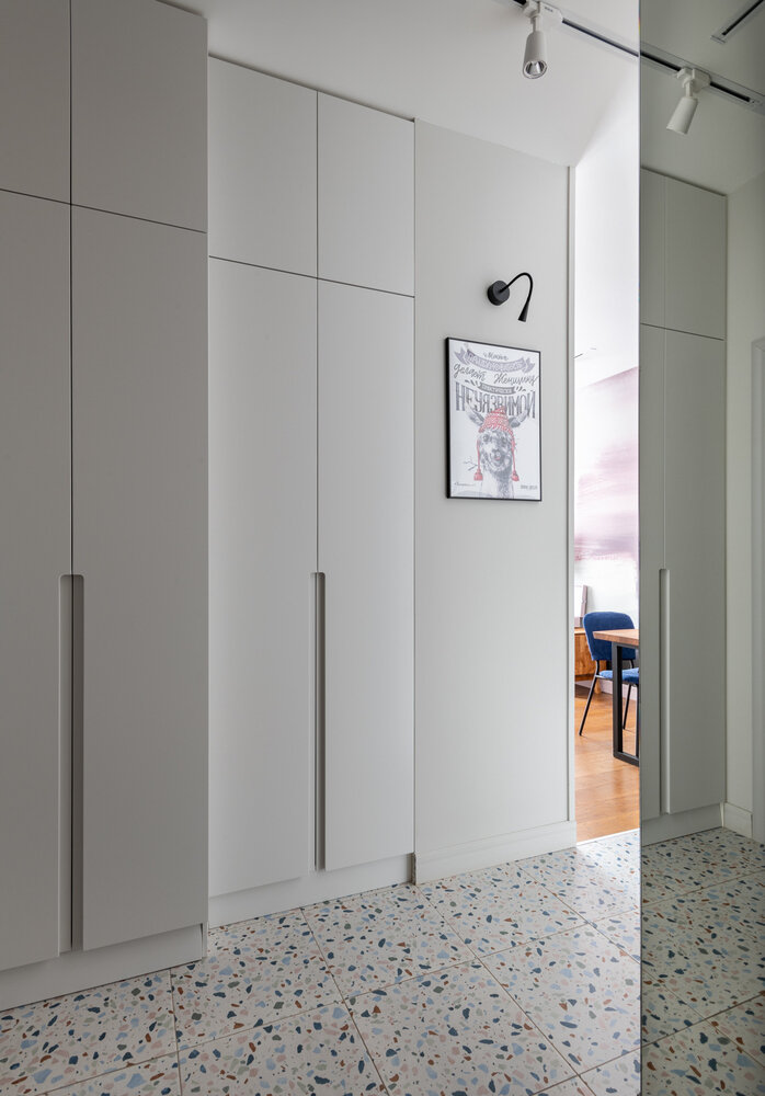 Уютная двушка 38 м² с белой кухней и ковром на стенеДизайн