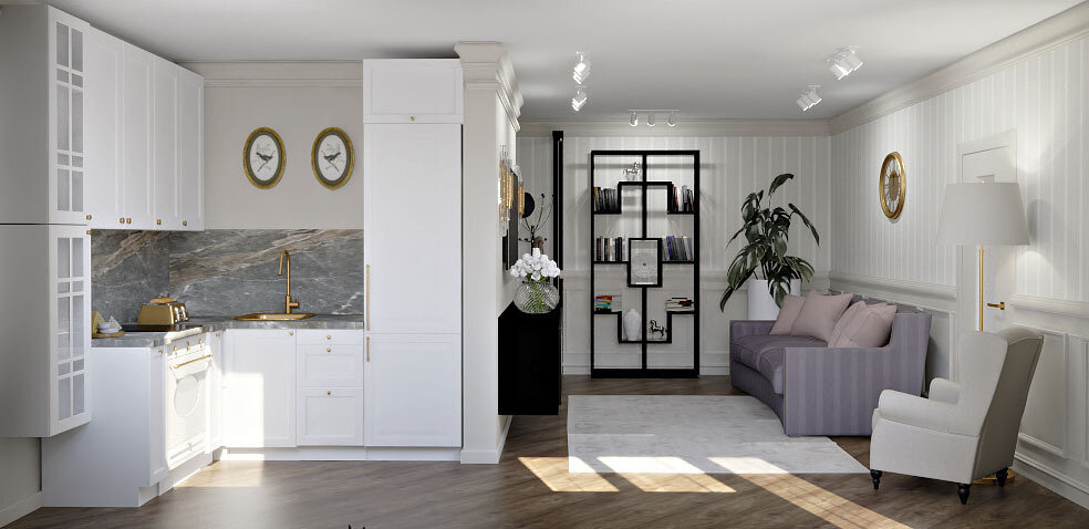 Стены в зоне кухни можно покрасить влагостойкой краской, а в гостиной декорировать обоями и молдингами.
