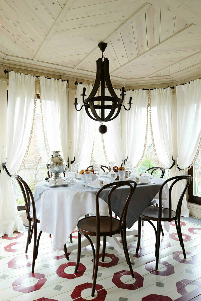 Дизайн: Павел Железнов, Татьяна Борисова. Дерево — классический материал на русских дачах — появилось в этом проекте на стенах, потолке и полу. Причем здесь сохранены естественный цвет и фактура, а на полу использовали необычный прием секционного окрашивания.