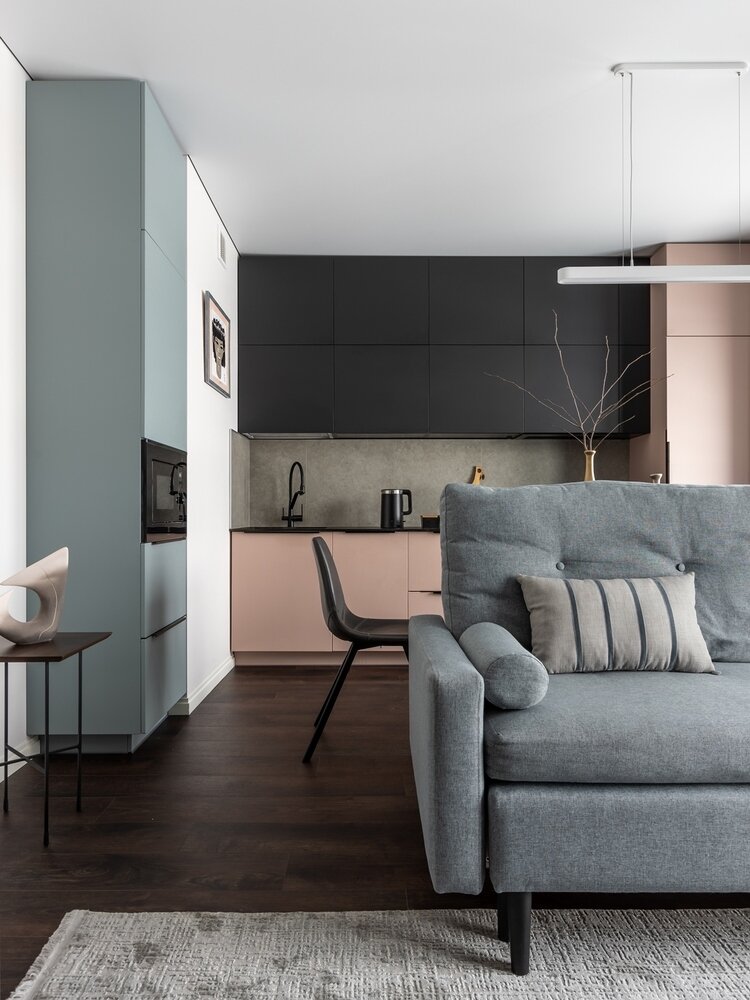 Сочетание розового цвета и более брутальных черного цвета и бетона тоже родилось из пожеланий заказчиков, микса их характеров.