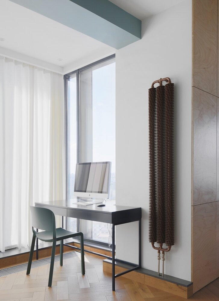 В спальне очень интересной деталью выступает радиатор. Благодаря своей необычной форме он оживляет пространство и выступает своеобразным арт-объектом.