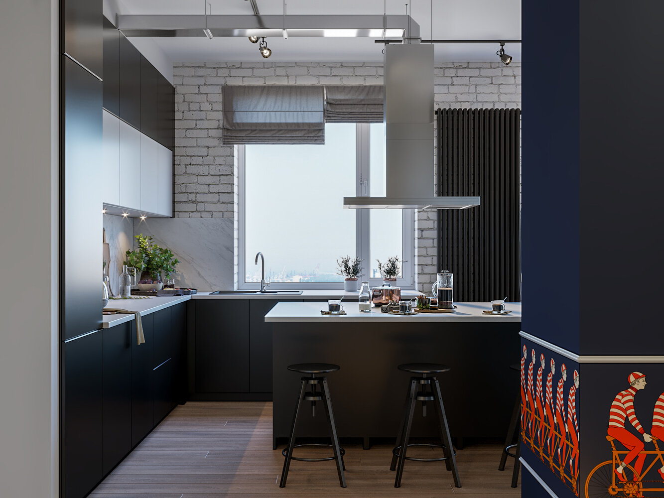 Трешка 92 м² с окном в ванной и кухонным островомДизайн