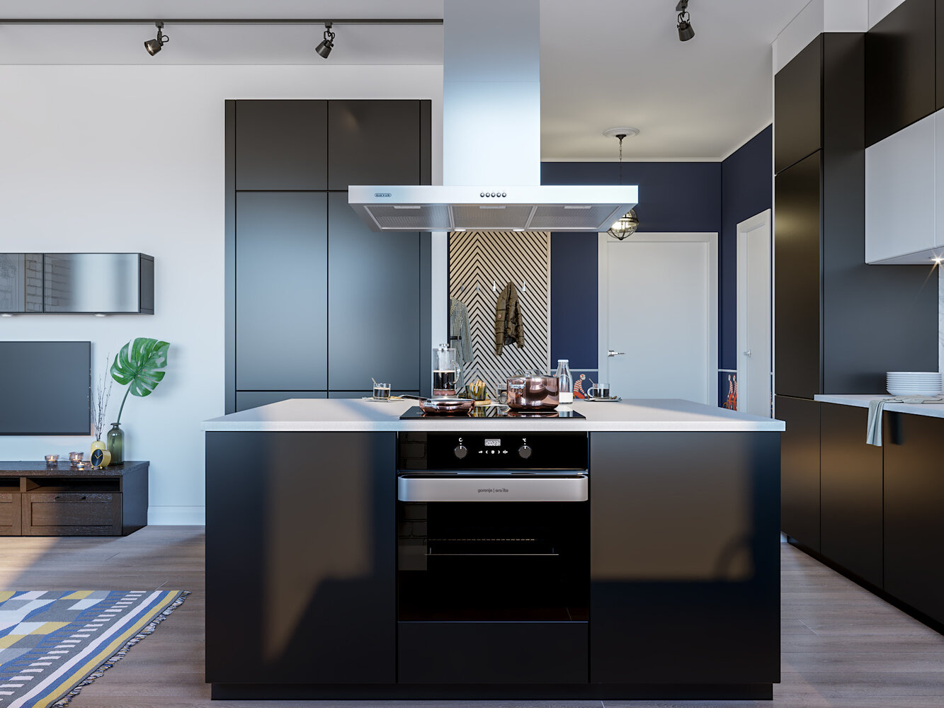 Трешка 92 м² с окном в ванной и кухонным островомДизайн