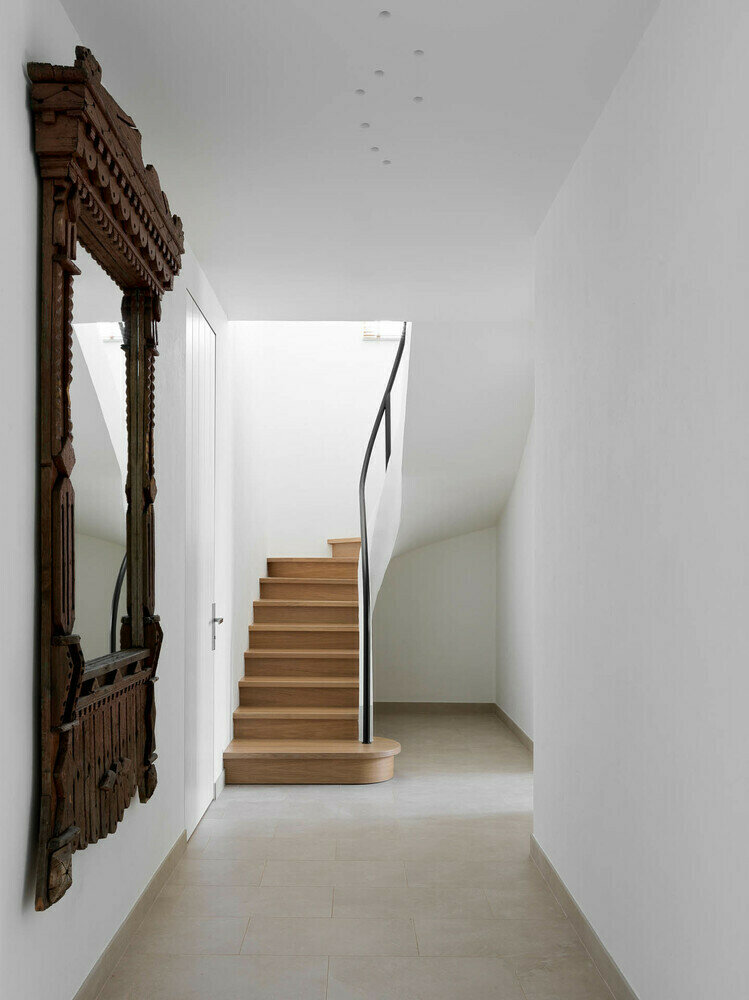 Зеркало, сделанное из старого наличника от русской избы, здорово вписалось в интерьер и дополнило идею русской дачи. Красивая и лаконичная лестница без пристенного плинтуса и без балясин у ограждения.