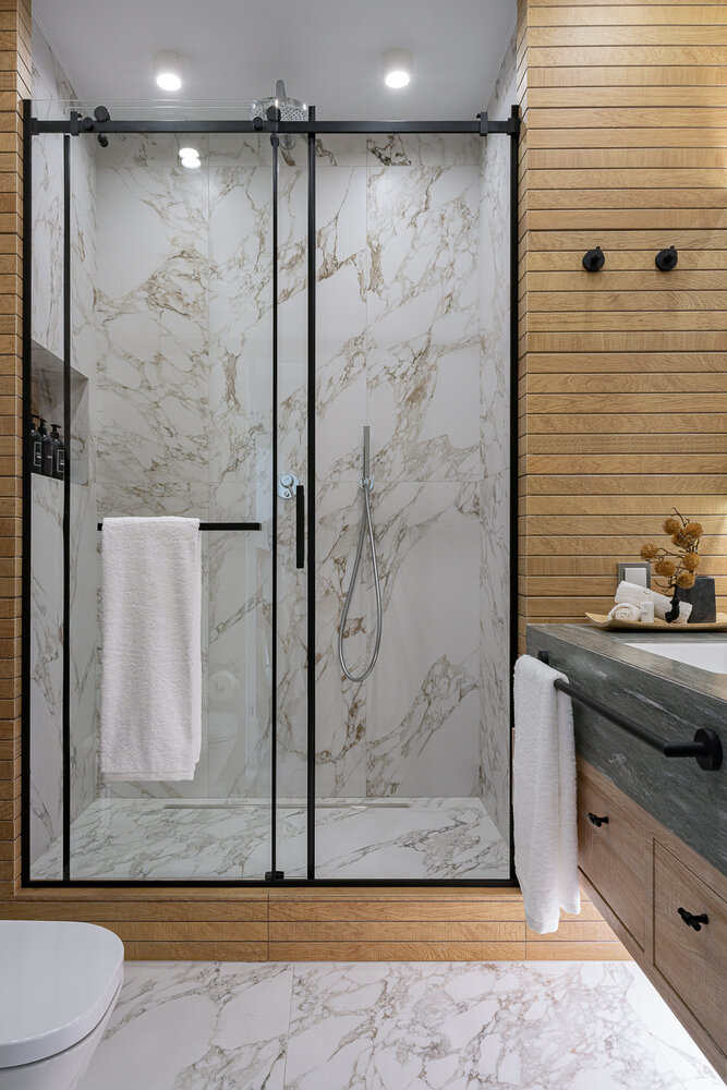 Сложный многослойный бежевый интерьер однушки 55 м²4,8