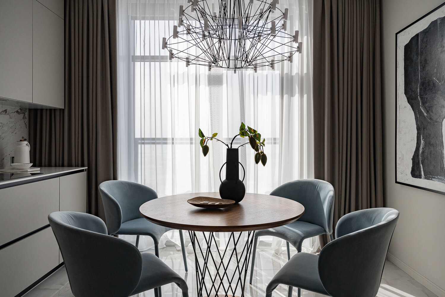 Сложный многослойный бежевый интерьер однушки 55 м²4,7