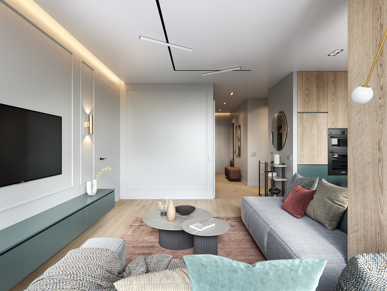 Во всех комнатах на полу уложен паркет, натуральный дуб. Стены окрашены глубокоматовой краской, основной цвет — светло-серый, в комнатах есть цветовые акценты. Акцентные стены декорированы реечными 3D-панелями и молдингами. Потолки натяжные, с теневым профилем и современными системами освещения — трековыми светильниками, нишами с подсветкой, встроенными светильниками.