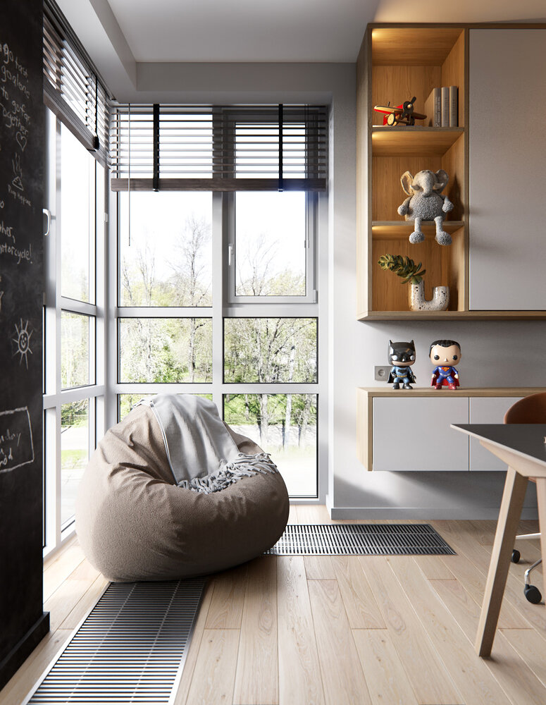 В детской комнате очень красивое угловое окно, через которое попадает много света на рабочую зону, и сама комната приобретает необычный вид.