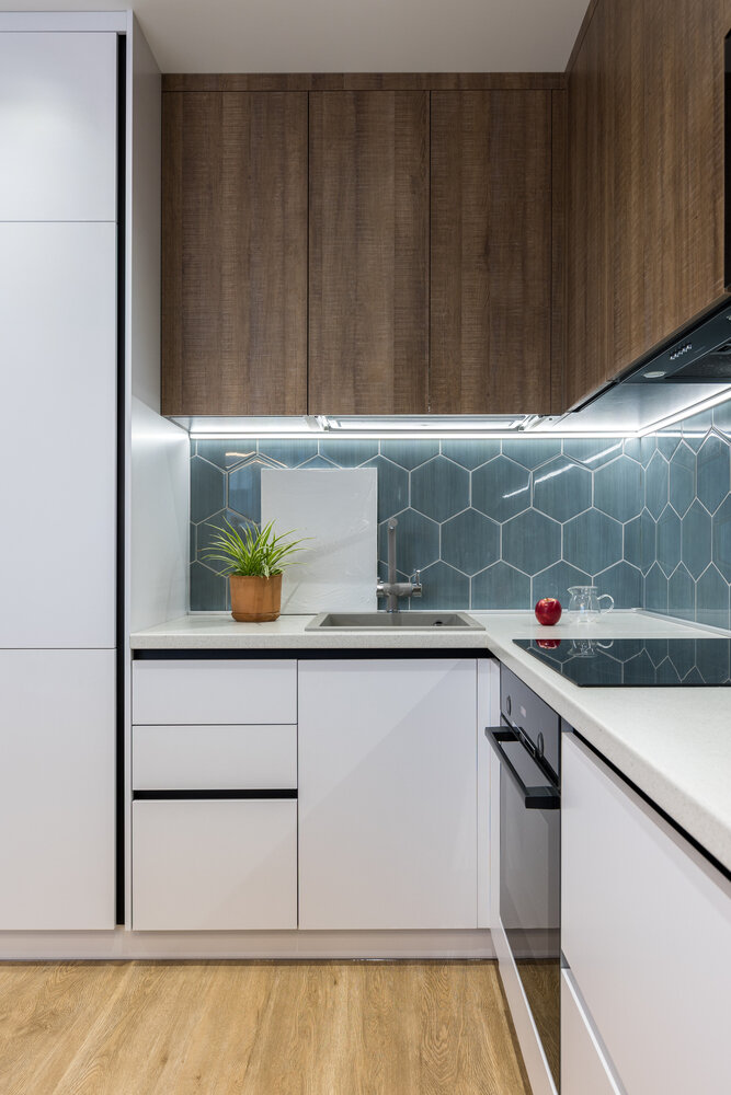 Гарнитур выполнен на заказ: шкафы с фасадами двух цветов.