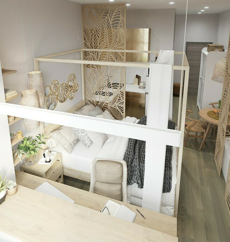 Крошечная эко-студия 24,5 м² с золотой кухнейДизайн