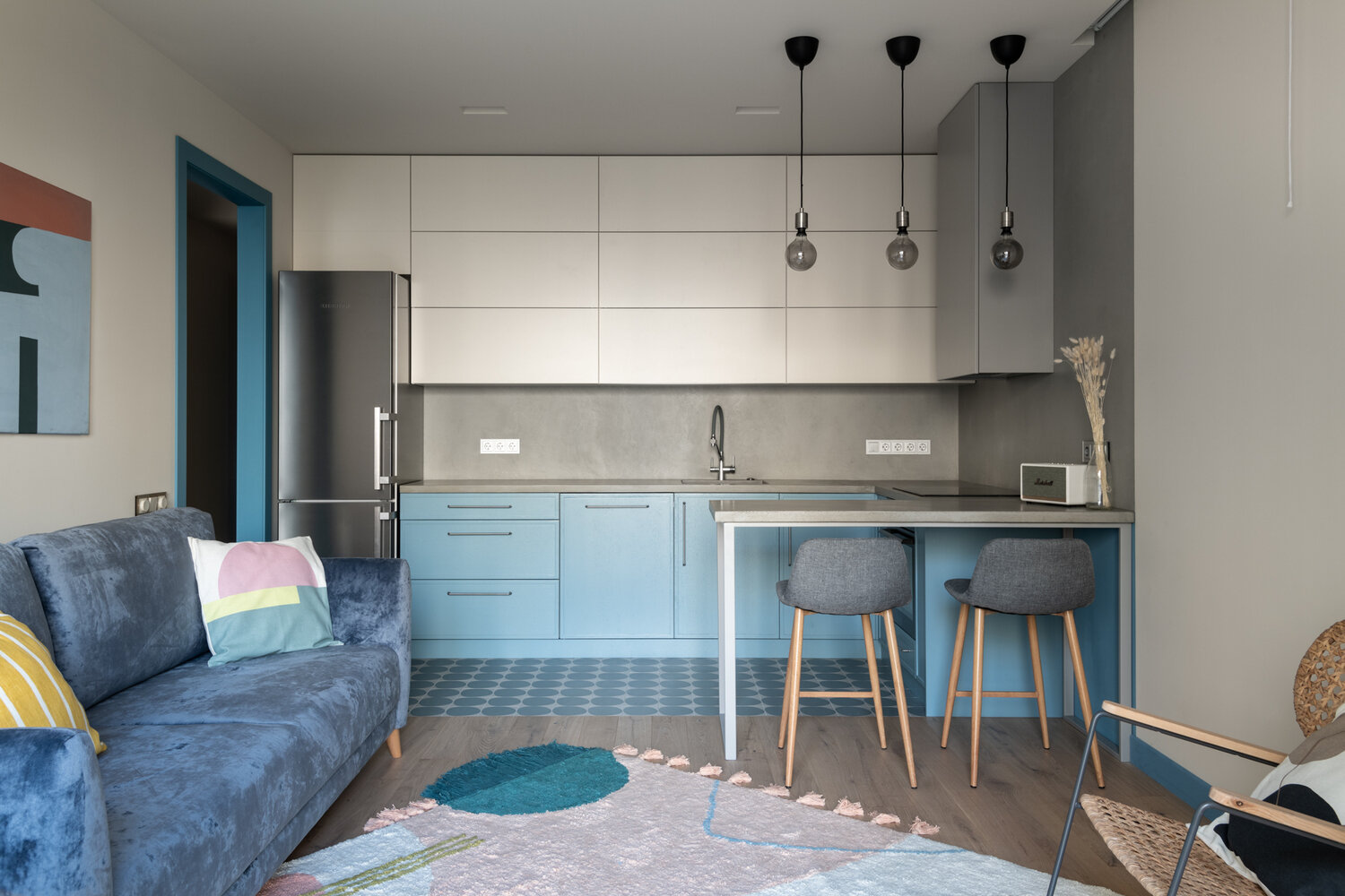 Трешка 85 м² с красивой плиткой и цветными потолкамиДизайн