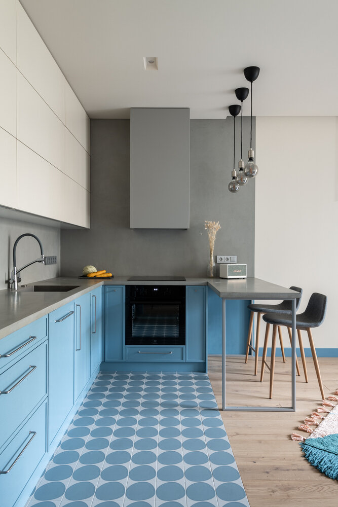 Трешка 85 м² с красивой плиткой и цветными потолкамиДизайн