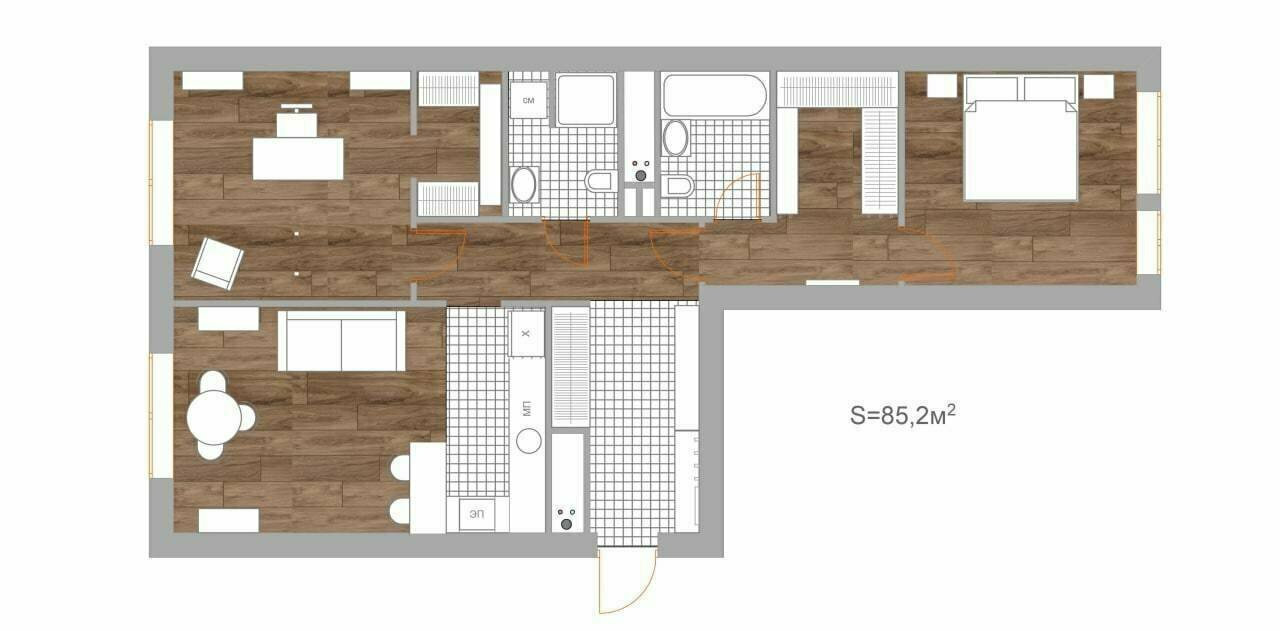 Трешка 85 м² с красивой плиткой и цветными потолкамиДизайн