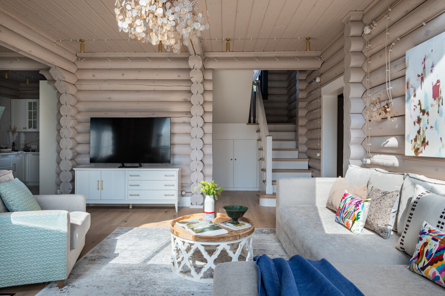 Красивый бревенчатый дом со вторым светом и каминомДизайн