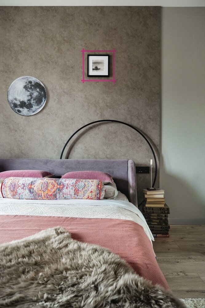 В изголовье использовали немецкие обои Rasch с эффектом штукатурки, приятная деталь при близком рассмотрении. Их легко поменять, и они на порядок дешевле декоративной штукатурки.