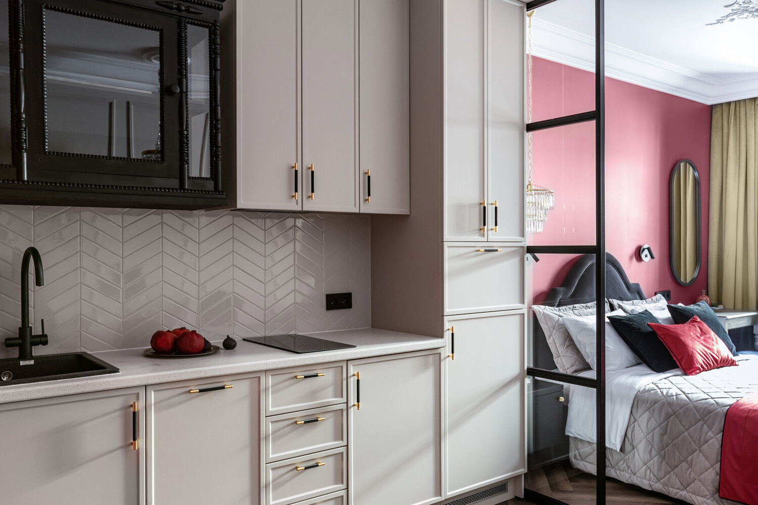 Квартира предназначена для коротких визитов в город, поэтому технику выбрали в компактном варианте: варочная панель на две конфорки, маленькая вытяжка, от духового шкафа отказались, зато установили посудомоечную машину.
