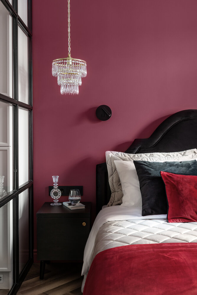 Над тумбочкой у кровати винтажный хрустальный подвес разместили для атмосферного света.