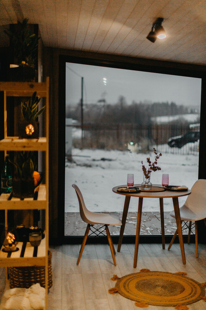 Около одного окна обустроили уютную столовую зону с круглым обеденным столиком и стульями. Летом мебель можно перенести на открытую веранду.