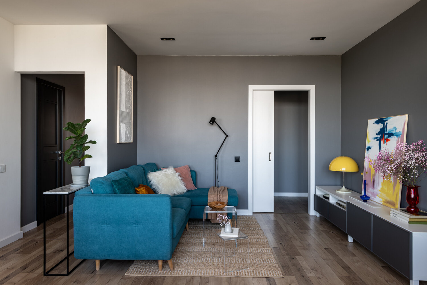 Во всей квартире, кроме санузлов, прихожей и гардеробной, уложили единое напольное покрытие — ламинат KAINDL. Он имеет цвет натурального дерева и интересный рисунок, имитирующий разноразмерные плашки дерева, что делает его похожим на паркет.