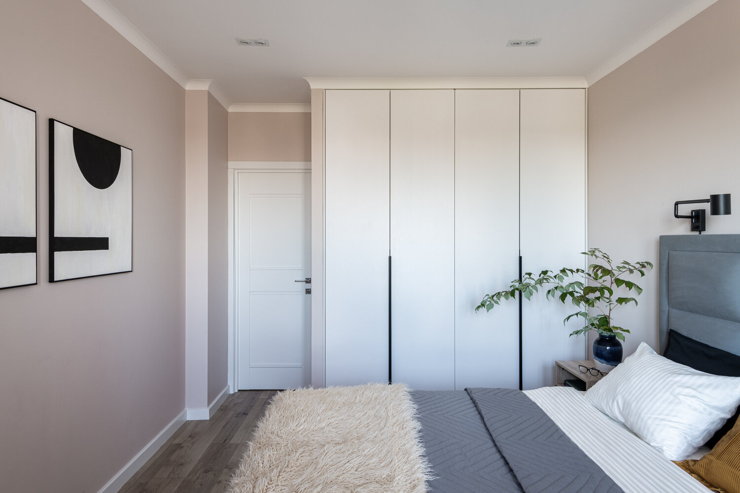 В спальне предусмотрели большой встроенный шкаф. Он очень вместительный, но за счет того, что вписан в нишу, не утяжеляет помещение. Черные высокие ручки добавляют графичности и изящности.