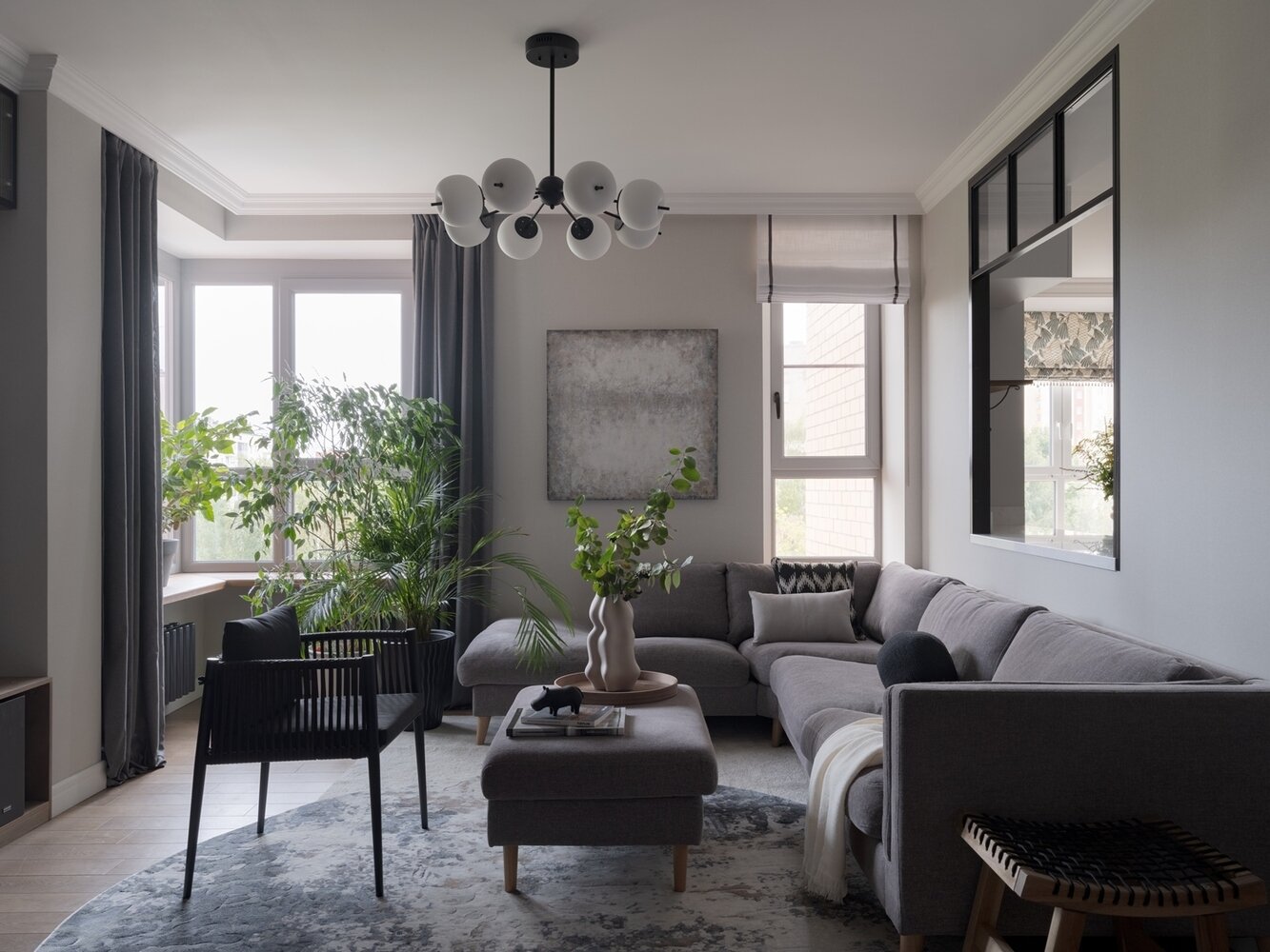 В гостиной несколько окон, и для каждого дизайнер предусмотрела свое оформление: обычные шторы и римскую штору.