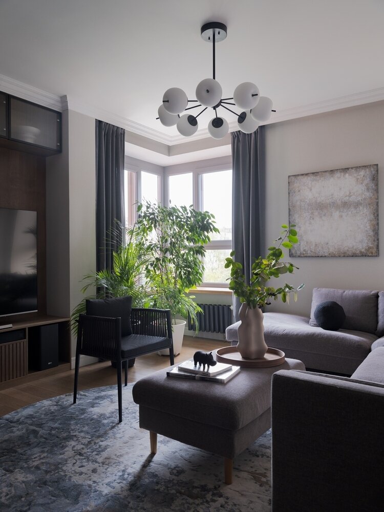 Массивный телевизор вписали в конструкцию темного цвета дерева, в которой спрятаны все коммуникации и необходимая техника. Сбоку эта система хранения переходит в открытый стеллаж для книг.