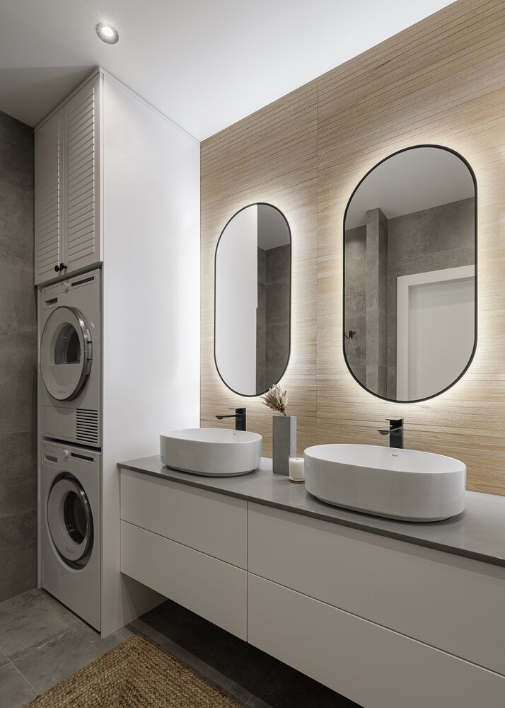 Так как зеркало овальное, сделать к нему металлическую черную раму непросто. Поэтому дизайнер пошла на хитрость: черный кант просто нарисован на зеркале. Визуально это не заметно.