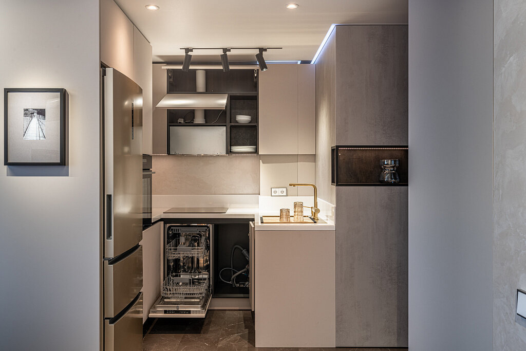 В нижнем ярусе установили узкую посудомоечную машину с тремя корзинами, рассчитанную на 11 комплектов посуды. Над стеклокерамической сенсорной варочной поверхностью смонтировали мощную вытяжку, алюминиевый фильтр которой можно мыть.