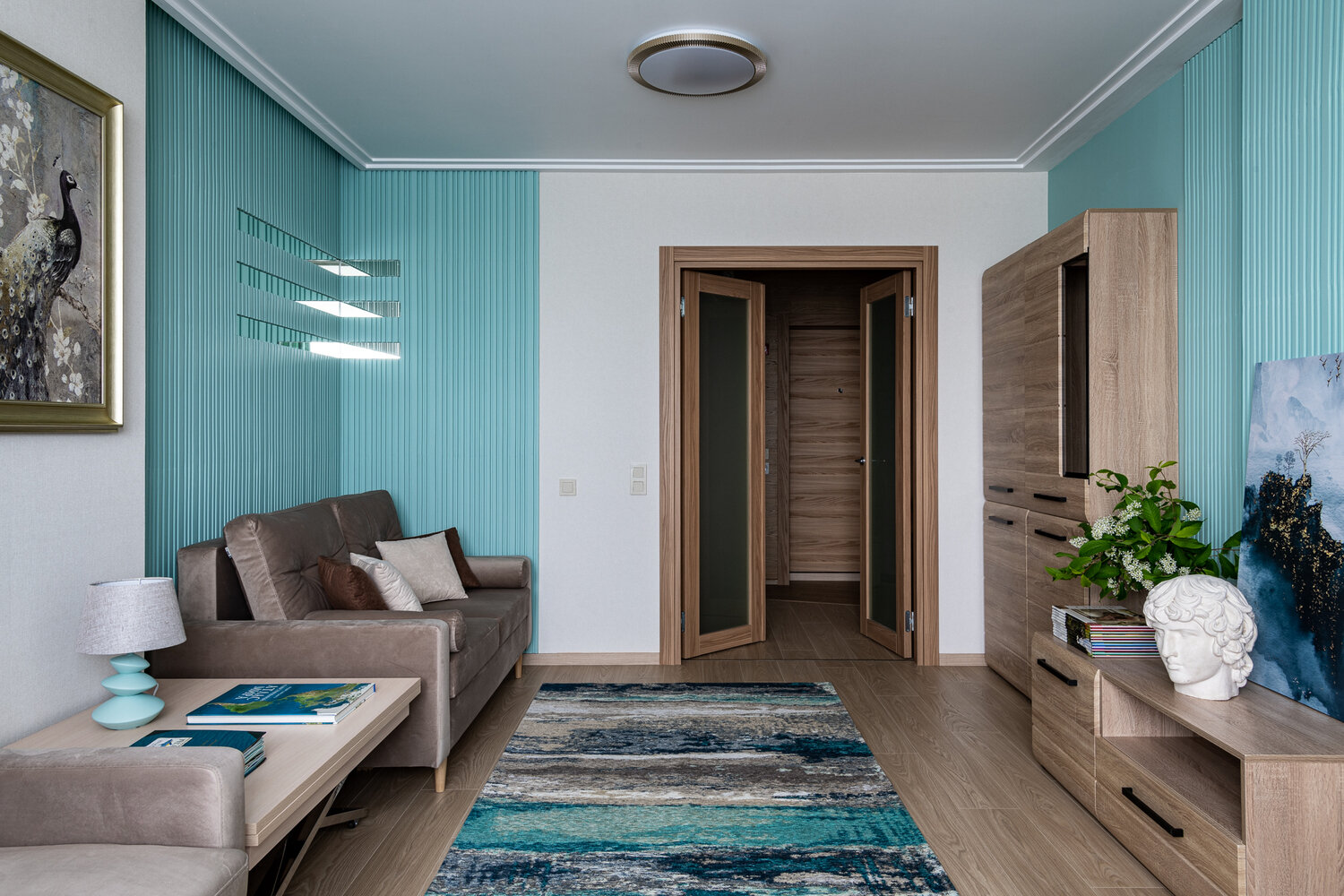 Базовый интерьер двушки 67 м² с цветными акцентамиДизайн