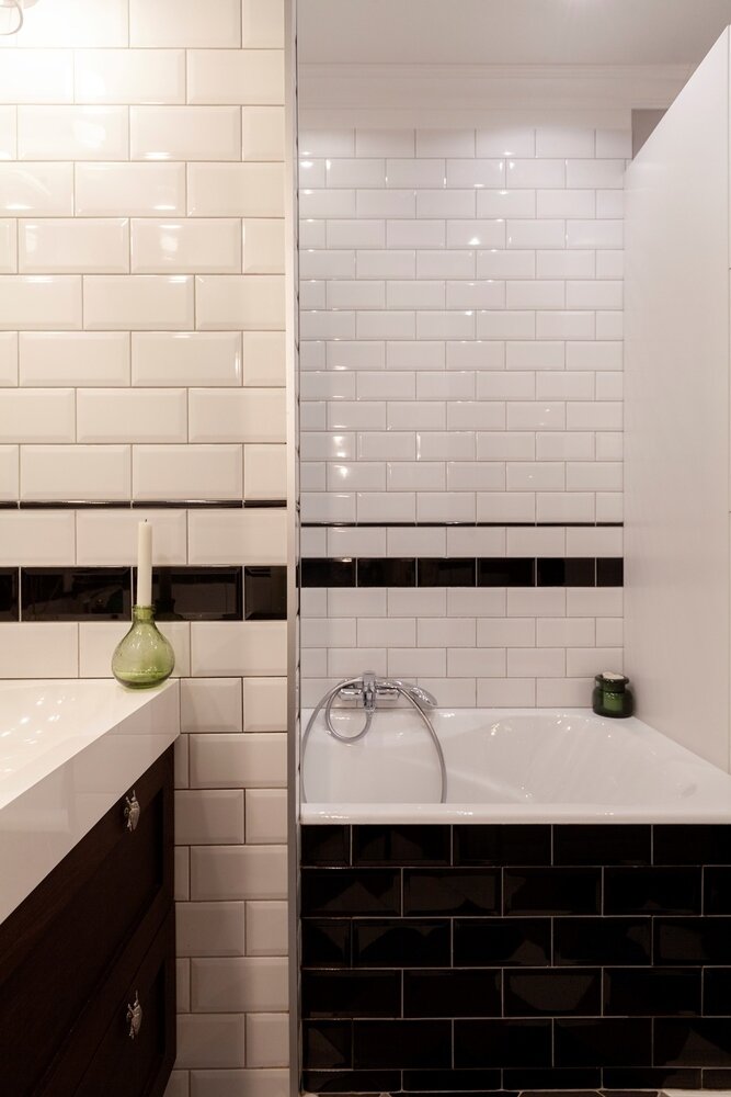 Стены ванной комнаты и фартук кухни оформлены классической раскладкой метро из испанской плитки, только в ванной дизайнер решила добавить графичности и декоративности стенам и ввела еще вставки из черных рядов плитки.