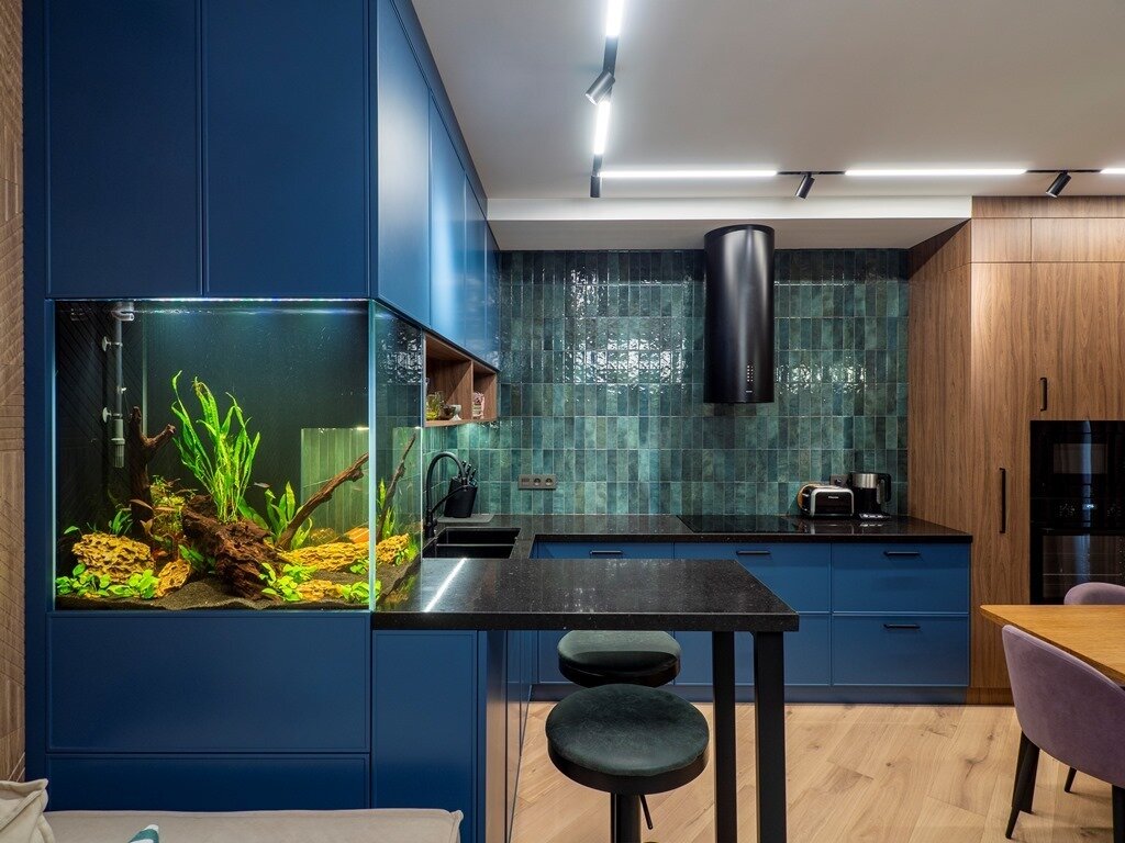 Снизу аквариума — также распашной фасад, где можно хранить корм, сачки.