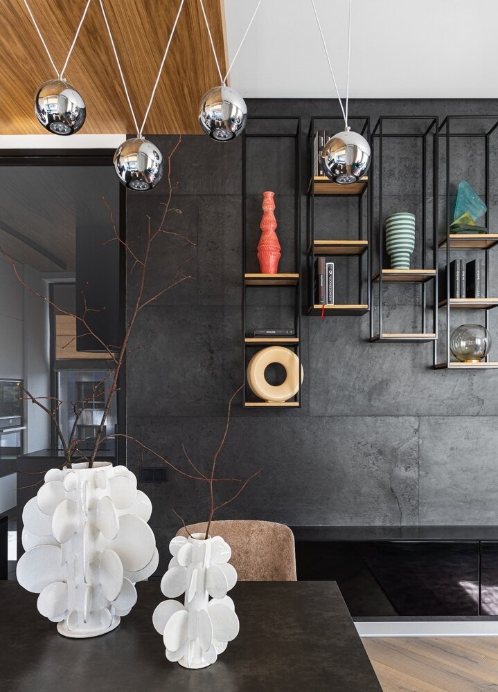 Интересна отделка стены в гостиной — черные панели каменного шпона. Это недорогое и практичное решение, они выглядят как натуральный камень, но при этом легкие, износостойкие и просто монтируются.