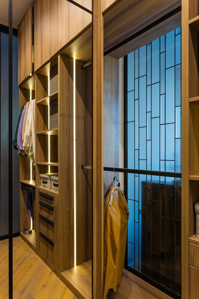 Гардеробная находится в приватной зоне. Часть стены в ней занимает стеклянный витраж, который со стороны спальни служит декоративным элементом, а в гардеробной — источником естественного света.