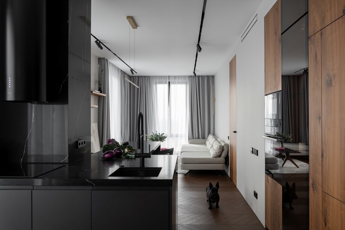 Стильный современный интерьер 88 м² с необычной кухней4,3