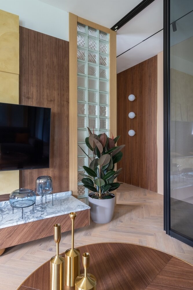 Перегородка из стеклоблоков выложена по технологии чистого сухого монтажа с минимальной толщиной швов в 4 мм при помощи специальных пластиковых комплектующих.