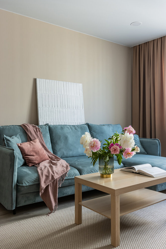 Двушка 71 м² с фактурной отделкой и яркими акцентамиДизайн