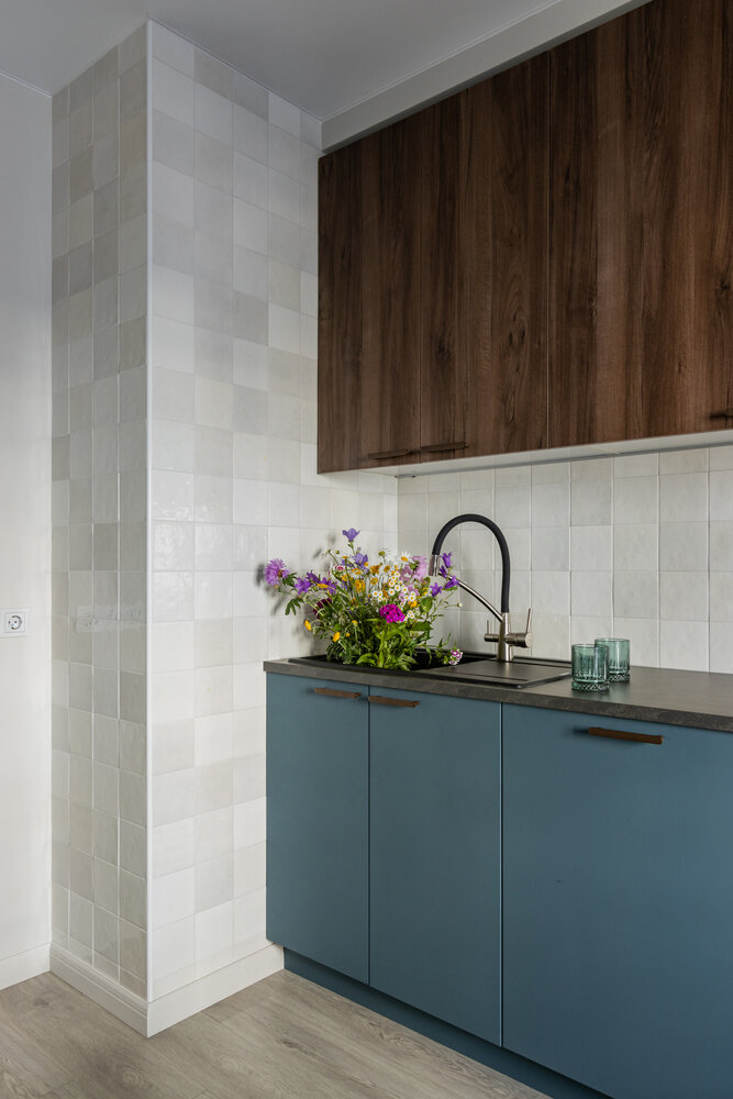Двушка 71 м² с фактурной отделкой и яркими акцентамиДизайн