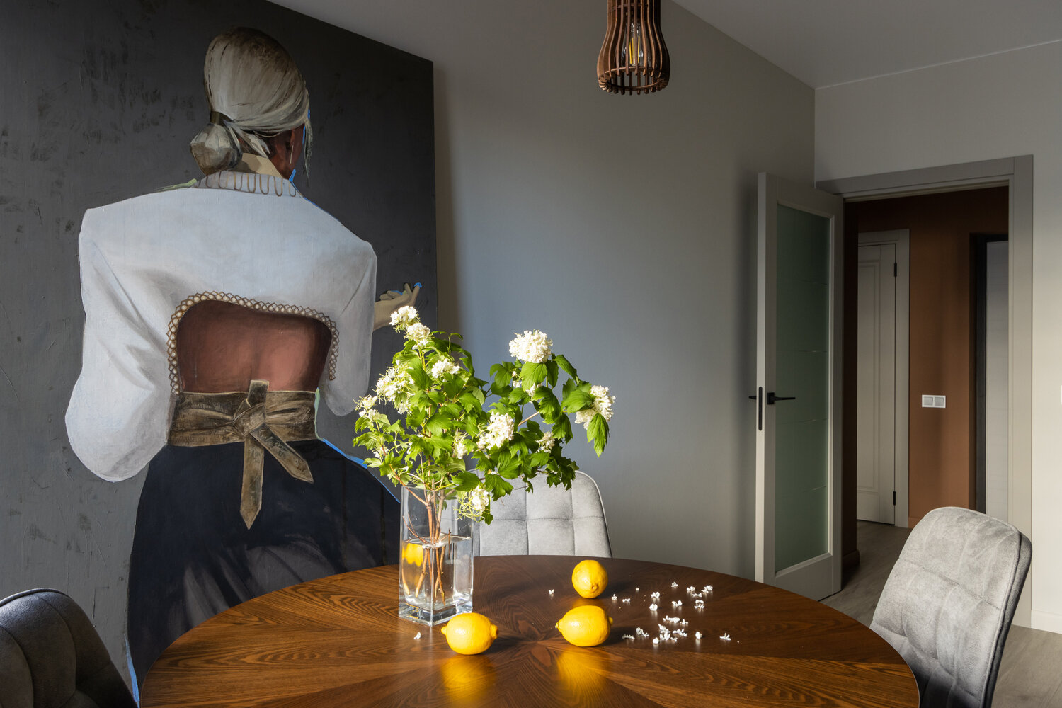 Двушка 71 м² с фактурной отделкой и яркими акцентамиДизайн